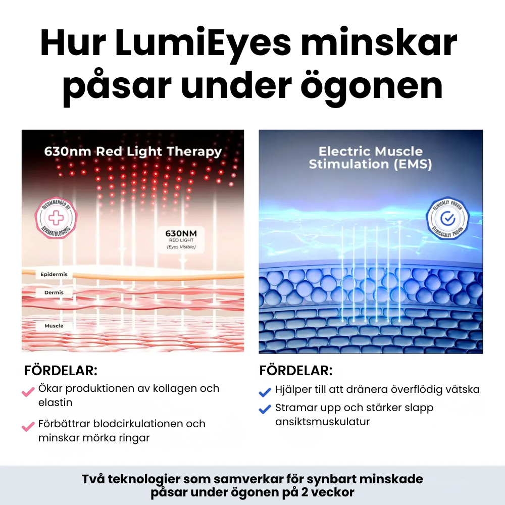 LumiEyes använder röd LED-ljusterapi (ljusdioder) med en våglängd på 630 nm. Denna specifika våglängd av rött ljus tränger in till ett djup av cirka 2 mm och når hudens djupare lager där kollagen och elastin finns. Den tränger inte in tillräckligt djupt för att nå eller skada känsliga ögonstrukturer som näthinnan.